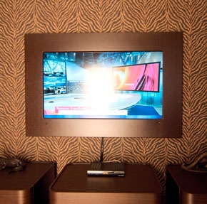 Рамка на плазменную панель вписалась в интерьер спальни, закрыв серебристую high-techовскую окантовку экрана. Для чего это было нужно? Дело в том, что выдержанный в темно-коричневых, точнее даже, шоколадных тонах, колористический рисунок этого помещения находится в разительном несоответствии, даже диссонансе, с корпусом панели high-techовского титанового цвета. Заказчик был абсолютно прав, задумав сделать декоративную рамку на телевизор, которая была бы одной фактуры с мебелью. К тому же, ширина рамки должна была стать такой же, как у настенного светильника, около 150мм. По внутреннему периметру рамки должен был находиться выступ, около 8мм, который бы касался непосредственно экрана, полностью закрывая титановый цвет. Были проделаны отверстия для ИК-луча проводов.