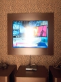 Рамка крепилась к брускам, привернутым к стене выше и ниже телевизора, с помощью четырех саморезов. Этот простой и надежный способ крепления позволяет быстро снимать и ставить ее на место. Жаль, нет фото, запечатлевшего телевизор в его первоначальном виде, чтобы сравнить с тем, что было.