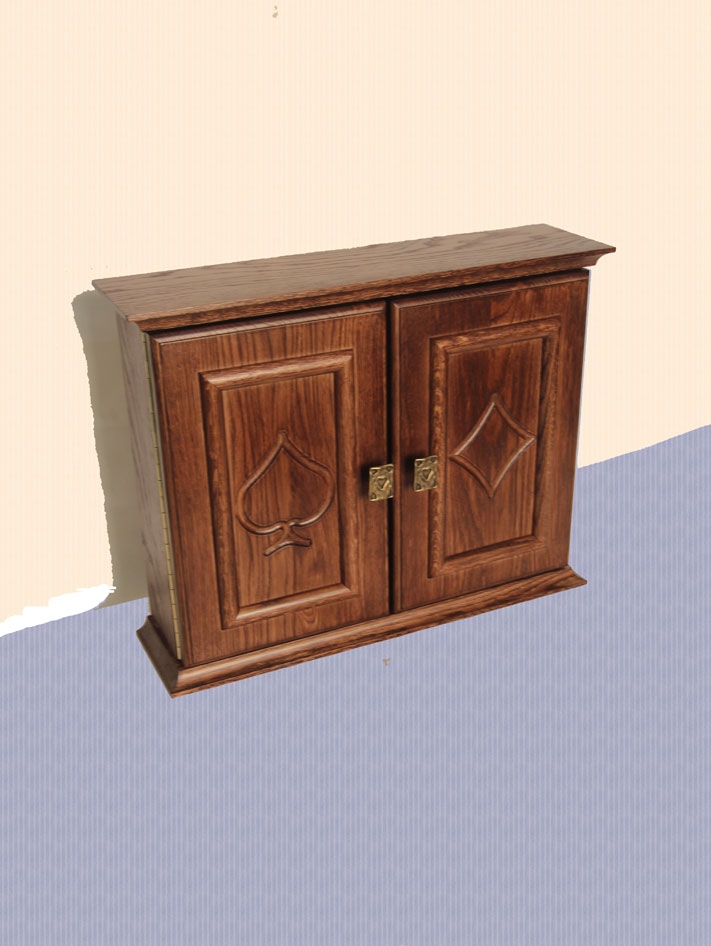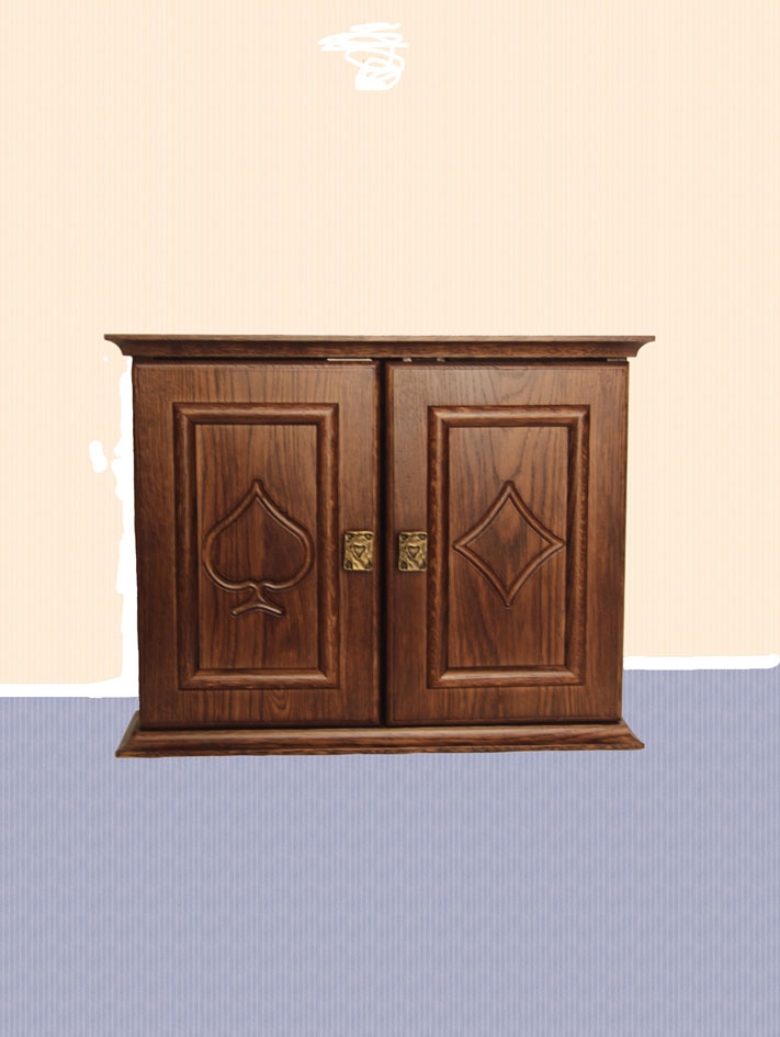 Ключница, или шкафчик для ключей и мелких предметов. явилась завершающим предметом в интерьере наряду с аркой, барной стойкой, потолочными плинтусами. Из готовление на заказ позволило выбрать размеры ключницы сообразно месту ее установки. Классический дизайн ключницы созвучен дизайну других вышеперечисленных предметов интерьера. Обозначенные контуром на дверцах ключницы масти игральных карт придают ей индивидуальность.
