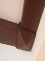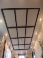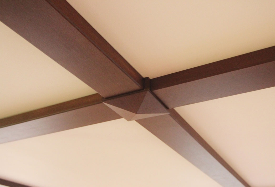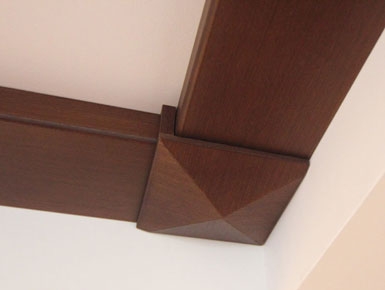 Имитация балок на центральной, более высокой, части потолка придала ему выразительный, контрастный вид, гармонируя с такого же цвета порталами в проемах комнаты. Стыки элементов задекорированы пирамидками. Таким образом. пирамидки, являясь декоративными элементами, еще и скрывают головки саморезов, крепящих балки к потолку. Использованный в балках и пирамидках материал - МДФ, облицованный шпоном венге. Такая конструкция достаточно универсальна и может быть использована на любых потолках. Пирамидки могут быть заменены плоскими накладками с декоративными розетками или без них