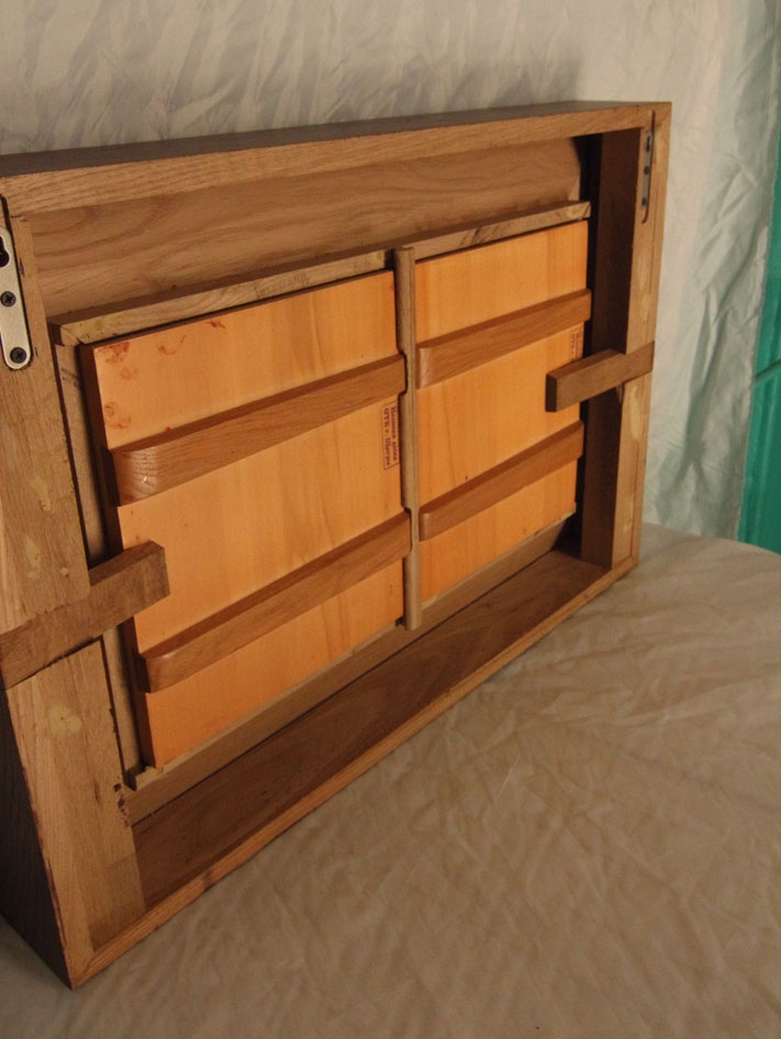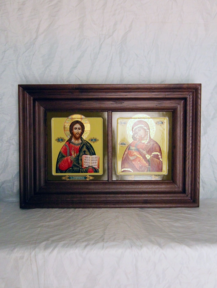 Рама из массива дуба для двух икон не содержит металлических деталей. кроме петель для навески. Иконы вставлются с тыльной стороны и крепятся все лишь одним клином каждая. Подобная рама может использоваться и для картин идл зеркал.
