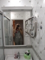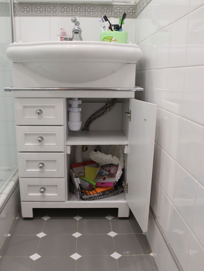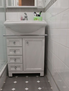 Тумба под раковину была сконструирована под узкий проем в ванной и под конкретную выбранную заказчиком раковину. Купить такую невозможно. В комплекте с тумбой требовлось зеркало с вырезом под розетки в правом углу. Учитывая расположение подводки и сливного отверстия под канализацию, ящики были сделаны уже, чем дверца. Зеркало имеет вырез и подсветку в карнизе над ним.