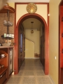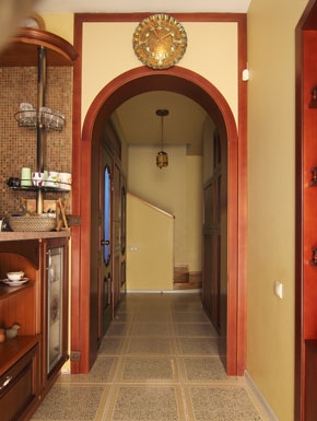 Арка с обрамлением прямым наличником и вставкой листа МДФ с покрытием эмалью удачно вписалась в проем, который ранее был облицован ламинатом темного цвета. Применение вставки, крашеной в цвет стен, позволило создать более легкую, не давящую конструкцию. Такая конструкция арки дает полет фантазии, позволяя делать вставки из шпона самых разных видов, обоев, пленок, пробки. и т.д. В данном интерьере эта арка скрыла к тому же следы протечек. Наличие вставки позволяет использовать ее для украшения часами или какими-то безделушками.